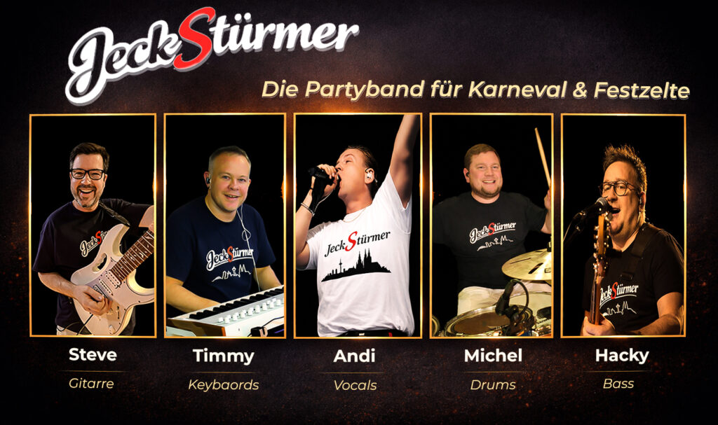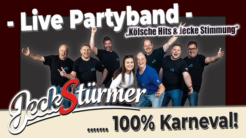 Die JeckStürmer sind die Karnevalsformation der Partyband WiesnStürmer und sorgen mit einem energiegeladenen Liveprogramm für ausgelassene Stimmung bei Karnevalsveranstaltungen jeder Art. Mit bekannten Karnevalshits, Partyklassikern und jeder Menge Publikumsanimation bringen wir Säle, Zelte und Open-Air-Bühnen zum Kochen.